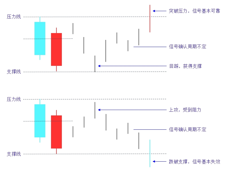 曙光初现形态一般以阴线的最高价作为压力,以阳线的最低价作为支撑,再结合股价的整体走势来判断信号的可靠性。突破压力,则认为信号基本可靠,跌破支撑,则认为信号基本失效。