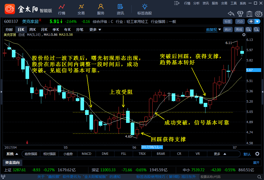 曙光初现同好友反攻一样,也预示着股价趋势的好转,从信号强度来讲,可以说是此类形态的中级版,高级版的叫旭日东升,这个我们后面的文章再讲解。