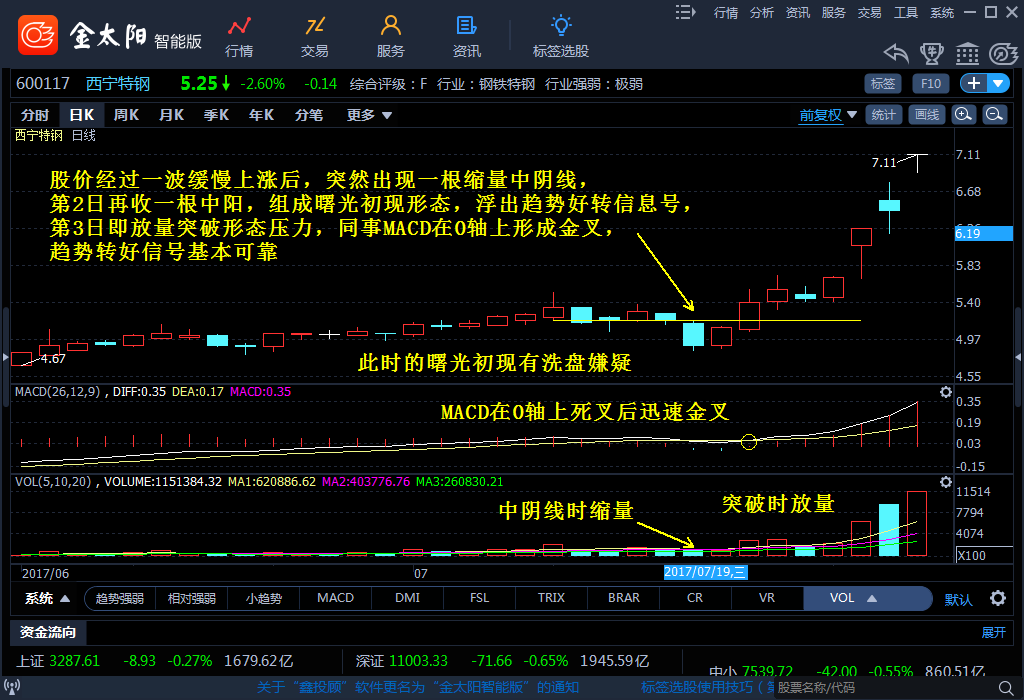 曙光初现也可能在大趋势启动前,以洗盘形式出现。这个时候同样需要详细甄别,防止形态信号预判失败,转而进入下跌。