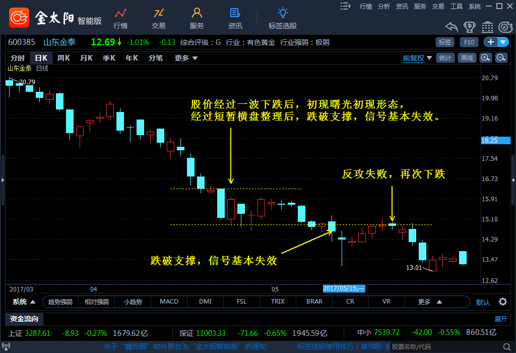 并不是所有的曙光初现形态出现后,股价趋势都会好转,空方太强势的情况下,股价仍会继续下跌。