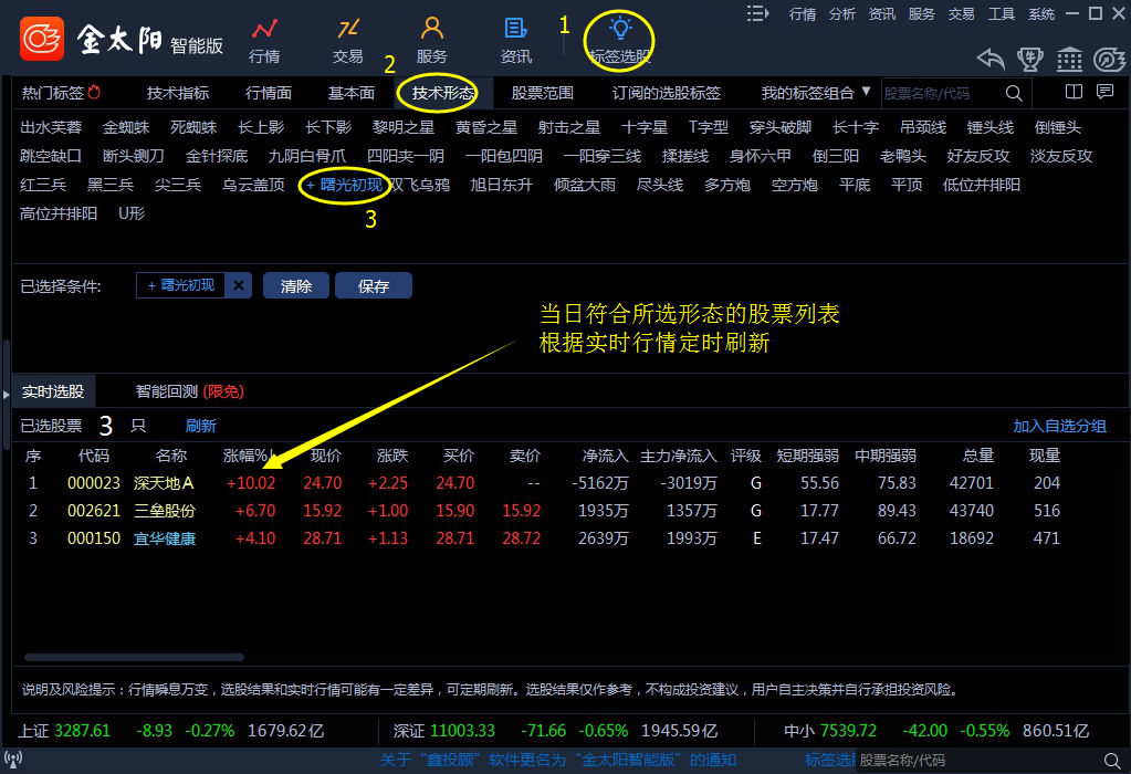 使用“金太阳智能版-标签选股”功能只需3步即可筛选出当日符合曙光初现形态的股票。